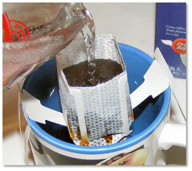 I discovered this interesting coffee at the local Chinatown market, and was intrigued more by the packaging than anything else. What you get is a six serving pack, each envelope containing a clever little one cup filter system and a (too small) packet of coffee. You unfold the packet and it hangs at the top of the cup, the top of the filter open, and you aim the water at the opening.
